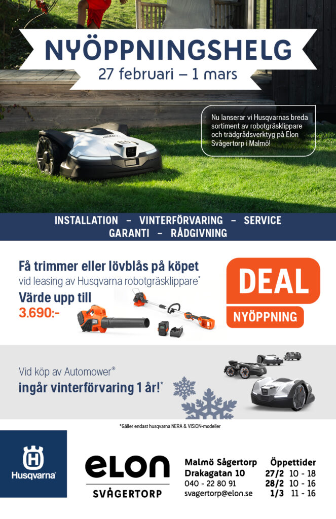 Vi hjälper dig med allt inom Husqvarna på Elon Svågertorp.Kontakta oss för frågor om Husqvarna:040 211 130husqvarna.malmo@elon.seAdress:Drakagatan 10, 21586 Malmö